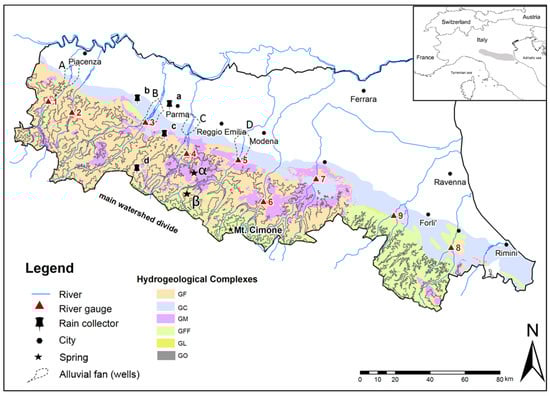 Sketch map of the area (modified after []) with locations where sampling has been carried out by previous studies for precipitation (rain gauges with letters a to d), surficial water (rivers numbered 1 to 9), groundwater from springs (Greek letters α and β), and groundwater from wells (located in the alluvial fans with capital letters A to D). Hydrogeological complexes are reported following []; GC: clay; GM: marl; GF: flysch; GFF: foreland flysch; GL: limestone; GO: ophiolite. For further details, see Table 1.
