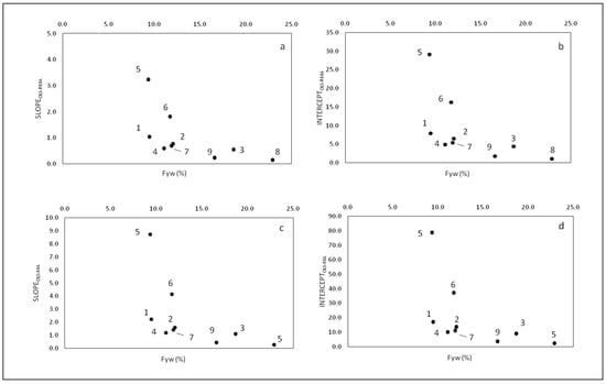 In the case of the Pearson rank correlation matrix applied to differences in intercepts, we did not find significant correlations (see Table 7). On the contrary, and as in the case of slopes, significant (p < 0.01) nonlinear relationships were found for Fyw (SlopeOLS–RMA and SlopeOLS–MA) and Hmin (negative correlation for SlopeOLS–B).