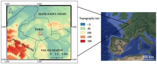Situation of the study area (a red point) in the city of Paris (France), with the coordinate system of RGF93, Lambert 93. Topographic data source is from the site urs.earthdata.nasa.gov accessed on 24 February 2022.
