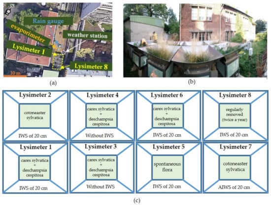 A top and panoramic views of the site in figures (a) (Source: google earth) and (b), respectively. The figure (c) illustrates the positions and the scientific names of vegetation in each lysimeter.