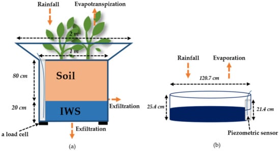 As the lysimeters are above the soil and therefore not insulated thermally compared to a situation in the ground, a 10 cm of expanded polystyrene insulation was added to all the vertical walls of lysimeters. At the bottom of each lysimeter, a 0.2 m layer of a manufactured alveolar product is installed to store rainwater (Nidaplast® product with a void index of 0.95) and a piezometer is installed to measure the water level in the internal water storage (IWS). The soil, with a thickness of 0.8 m in each lysimeter represents a natural silty-clay soil used in the city’s parks and gardens of Paris region; it contains little limestone, 18 to 25% of clay, with a neutral to basic pH (7.5–8). Weighing cells and a tipping bucket allow the measurement of mass variation and exfiltration at the bottom of each lysimeter respectively (see Figure 3). A pan evaporimeter with a diameter of 1.2 m was also installed to control the quantity of water evaporated.