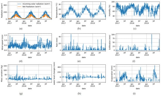 Meteorological variables: (a) daily incoming solar radiation and net radiation, (b) mean air temperature measured at 2 m, (c) relative air humidity, (d) wind speed, and (e) rainfall, (f) exfiltration, lysimeter daily (g) mass changes, (h) water level variation from the reference lysimeter 1 are added (mm), and (i) evaporation estimated from the evaporimeter.