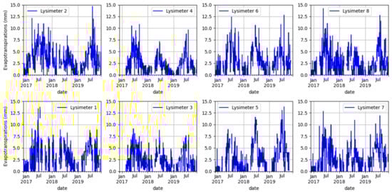 Validated ET data after processing for the three years (1096 days) vary from 53% to 68% depending on the lysimeter (Table A1). In Figure 5, the validated ET for each lysimeter is presented. The annual dynamics of ET are shown with high daily values that can exceed 10 mm between spring and summer and small values in winter and autumn. These seasonality patterns can be linked to the atmospheric factors described above. The main atmospheric factors affecting ET in these systems are discussed later in Section 3.3.