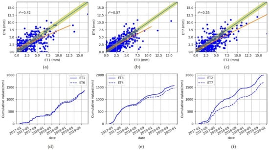 Regressions (a–c) and cumulatives (d–f) plots comparing the three replicas ET1/ET6 (data = 445), ET3/ET4 (data = 600) and ET2/ET7 (data = 583) for the three years (1096 days). The red line refers to the regression line and the blue line represents the y = x surrounded by the confidence interval (at 95%) that corresponds to the square root of the sums of the squares of the lysimeter uncertainties for each replica (0.79 mm, 0.63 mm, and 0.71 mm, respectively for ET1/ET6, ET3/ET3, and ET2/ET7).