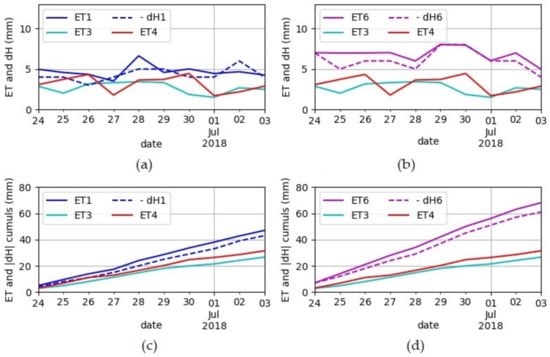 Evapotranspirations (ETs) and water level variations (dH) in the internal water storage for lysimeters 1, 3, and 4 (a) and lysimeters 6, 3, and 4 (b) during a summer period (24 June to 3 July 2018). (c,d) show cumulative values for ETs and respectively, for lysimeters 1, 3, 4, and lysimeters 6, 3, and 4.