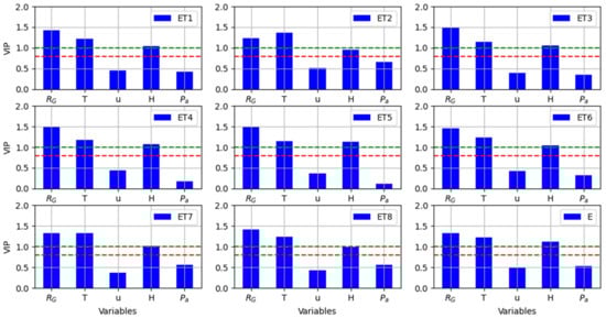 A more detailed analysis with PSL models confirms that for all measuring devices (lysimeters and evaporimeter), air temperature and global radiation are the most important variables influencing evapotranspiration with a VIP score greater than one (Figure 9). Moreover, air humidity has a moderate influence on ET in rain gardens (VIP between 0.8 and 1), but for the evaporimeter, it appears as an important determinant for the process (VIP > 1). As previously, wind speed and atmospheric pressure seem to be of low importance. In synthesis, the main atmospheric factors that impact the ET process in these devices are global radiation, air temperature, and air humidity.