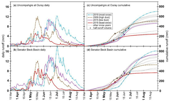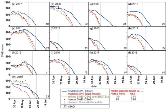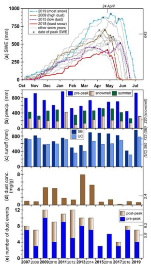 - Painter, T.H.; Skiles, S.M.; Deems, J.S.; Brandt, W.T.; Dozier, J. Variation in Rising Limb of Colorado River Snowmelt Runoff Hydrograph Controlled by Dust Radiative Forcing in Snow. Geophys. Res. Lett. 2018, 45, 797–808. [Google Scholar] [CrossRef]