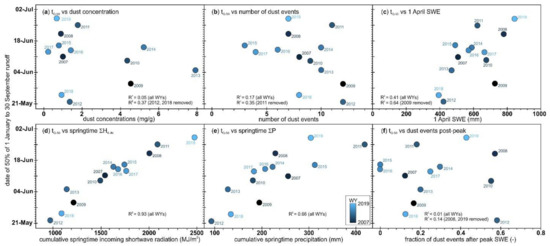 | WY | Dust Conc. (mg/g) | Dust Events | ΣHK-IN (MJ/m2) | Σprecip (mm) | 1 April SWE (mm) | Fraction of Dust Events Post-Peak SWE | DEAE (W/m2) | ΔSAG (Days) | tQ50 (Date) |