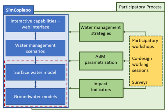General methodological framework highlighting development of the digital platform SimCopiapo, participatory processes and the integration of the surface water and groundwater models (red dashed line).