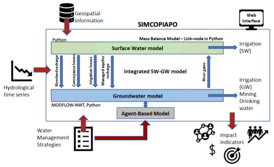 SimCopiapo digital platform and interactions of the integrated surface water and groundwater models and different modules and platform components.
