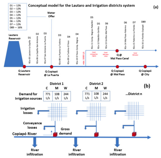 Conceptual model for the (a) operation of the Lautaro Reservoir and the (b) irrigation districts in the Copiapó River Basin. Values for parameters of the conceptual model are obtained from [39,40] and included in the node–link water balance model. Water sources for each irrigation district are distinguished between C: channel, W: wells and M: mixed source and are based on crop area supplied by that source.