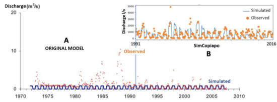 As the main driver controlling surface water flows and the recharge to aquifers is the operation of the Lautaro Reservoir, we focused on reproducing the observed discharges measured at the gauging station immediately downstream of the Lautaro Reservoir (Figure 5). For the simulated period implemented in SimCopiapo (1991–2016), we observe a much better correspondence between observed and simulated discharges compared to the original surface water models implemented by [40,41]. In general, peak releases are properly simulated with the exceptions of hydrological years 1997/1998 and 2001/2002, where both the original surface water model and the node–link model implemented in SimCopiapo show difficulties in capturing the peak behaviour.