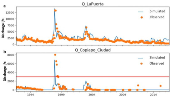 Simulated versus observed discharges in (a) “Rio Copiapó en La Puerta” and (b) “Rio Copiapó en Ciudad” gauging stations. Horizontal red line represents the average controlled discharge from Lautaro Reservoir (3020 L/s).