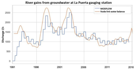 Closing the water balance obtained from loosely-coupled surface water and groundwater models has been identified as a drawback of the integration process [16,55]. La Puerta gauging station in the CRB is the main control point to verify that the coupling process of both the daily node–link mass balance model (implemented in Python) and the MODFLOW model (implemented in FloPy) is correct. In this sector, the Copiapó valley shows an important reduction in its cross section, and basement rocks are uplifted, thus substantially constraining the aquifer cross section, resulting in substantial contributions from the aquifer to the Copiapó River [39,49]. In general, discharges at La Puerta gauging station are influenced by the groundwater throughflows from groundwater sector 2 and the infiltration rates from the Lautaro Reservoir (see Figure 1). The infiltration losses in the Lautaro Reservoir were therefore adjusted between 500 L/s and 3500 L/s (as a function of the stored volume) until a reasonable match between the daily node–link mass balance model and groundwater model outputs at La Puerta was obtained. Figure 7 shows the match between both the node–link water balance and MODFLOW models at La Puerta gauging station. In general, we observe a good match between river gains from groundwater simulated through the drain package of MODFLOW and the node balance at La Puerta gauging station. We observe a good fit when simulating the temporality and magnitude of the time series, with a range between 1000 and 2500 L/s at “Rio Copiapó en La Puerta”. Few discrepancies are observed at the start of the simulation period, most likely attributed to the stabilisation of parameters in the node–link model (warm-up period) and due to the aggregation of the monthly time steps into 6 month stress periods in MODFLOW.