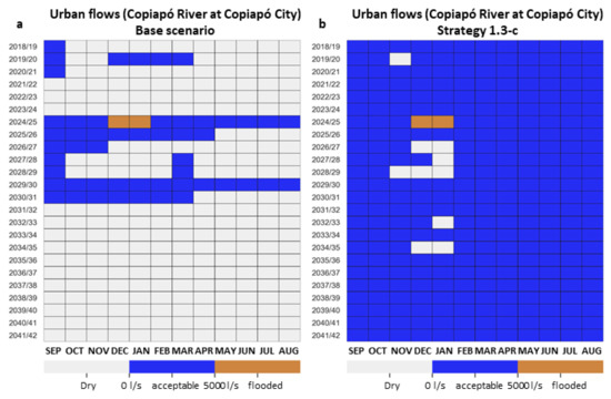 Monthly frequency of occurrence of urban flows at the Copiapó City gauging station for (a) base scenario and (b) strategy 1.3-c, for dry, acceptable, and flooded thresholds. Blue cells record the occurrence of average monthly discharges greater than 0 L/s and less than 5000 L/s at Copiapó city.