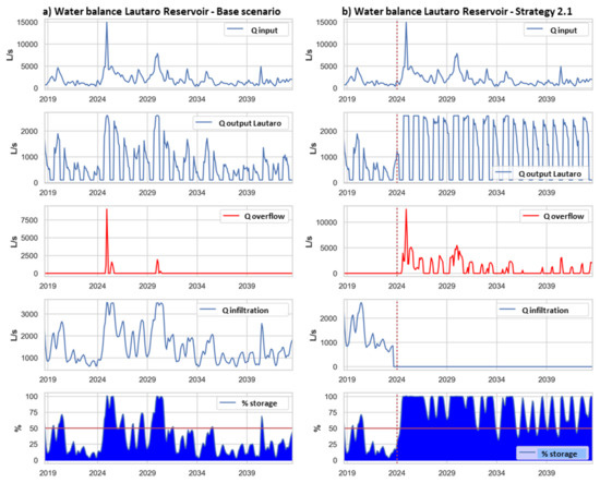 Water balance for the Lautaro Reservoir for (a) base scenario and (b) strategy 2.1, reflecting the impermeabilisation of 100% inundated surface after a 5 year period (vertical red dotted line).