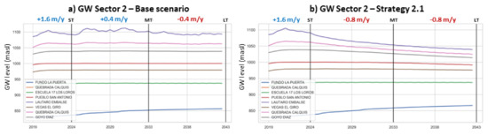 All these positive impacts also carry a negative impact, which is the detrimental impact on groundwater heads and stored volumes in the upper section of the aquifer sector 2, immediately downstream of the Lautaro Reservoir. Figure 13 shows that after implementing the combination of water management strategies, decreases in groundwater heads in the upper section of aquifer sector 2 can reach up to 40 m compared to the base scenario. Long-term increases in groundwater heads in sectors 3 and 4 can reach between 30 m and 40 m in aquifers immediately downstream of La Puerta gauging station and around 10 m in aquifer sector 5 downstream of Copiapó City gauging station.