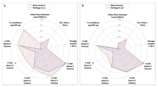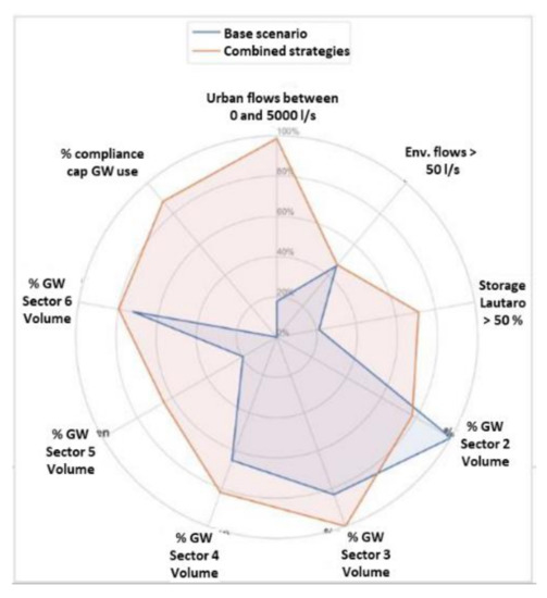 Figure 12 shows the results for impact indicators when combining these strategies. We found a substantial increase in the occurrence of urban flows from 20% to ca. 100% of the simulated period (25 years), thus enhancing the quality of life perceived by stakeholders of the CRB; marginal increases in the environmental flows at the basin outlet, thus promoting a healthy habitat for the wetland at the Copiapó River mouth; substantial increases in the storage volume of the Lautaro Reservoir from 20% to 72% of the simulated time with volumes greater than 50% its maximum storage capacity, thus impacting water security for irrigation districts; recoveries in heads and stored volumes in groundwater sectors 3, 4, 5 and 6, thus decreasing pumping costs to users and contributing to groundwater sustainability in the long-term; high levels of compliance (>80% groundwater users) to caps on groundwater use supported by a robust enforcement policy formulated around high monitoring rates and substantial fines.