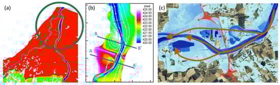 The 1D approximation itself implies that it is necessary to define cross sections that are perpendicular to a longitudinal axis. This is difficult to achieve in rivers with high sinuosity or in urban river reaches, where the flood plain is generally occupied by buildings and other infrastructure. Moreover, in high-sinuosity rivers the streamlines might have very different trajectories during low and high flows, as shown in Figure 1.