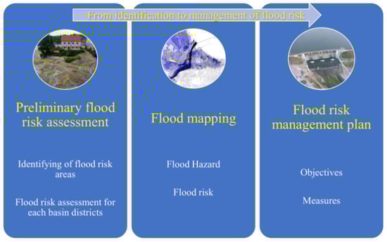 For this purpose, a three-stage process has been established (see Figure 4), which must be updated every six years in coordination with the Water Framework Directive []. The first step is a preliminary flood-risk assessment, characterized by the identification of the areas of potential significant flood risk (APSFRs) for each river basin. In the second stage, flood-hazard and flood-risk maps are drawn, showing the potential consequences of floods of different magnitudes. The final step involves the development of FRM plans, in which specific measures have to be implemented according to the characteristics of hazard and risk of each APSFR.