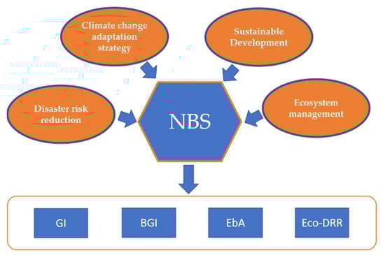 These new approaches to disaster-risk reduction, water security, and resilience to climate change, which have the potential to be more effective and sustainable than traditional measures, are currently referred to as nature-based solutions (NBSs) (Figure 8). The term NBS refers to innovative solutions for solving a range of societal and environmental challenges based on natural processes and ecosystems. NBSs use nature and natural processes to reduce disaster risk and enhance environmental, economic, and social benefits []. They represent a set of new concepts in engineering, economics, and environmental planning and they also provide simultaneous benefits for human and natural systems by maintaining and/or restoring hydrological functions []. Therefore, they are able to effectively and adaptively address water problems through sustainably managing and restoring natural or modified ecosystems, while alleviating the adverse impacts of climate change [].