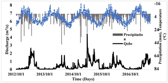 Daily discharge and rainfall data from 1 October 2012 to 30 June 2017 was utilized in the study (Figure 2). Climatological data were acquired from the weather station situated inside the catchment. However, some of the data were missing, which were consequently acquired from a nearby Kastamonu station, which has an elevation of 1000 m above sea level. Owing to the elevation difference between both the stations and to make us believe in using data from a lower elevation meteorological station, the Spearman rho statistical correlation and Mann–Kendall tests were employed, which exhibited good correlation to approximate the missing data. Daily evapotranspiration values were estimated by using Penman–Monteith method using R environment.