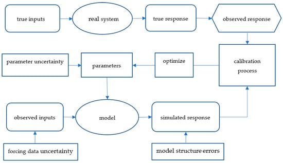 Imitation of the system under consideration by the assessed parameters is vital in catchment modeling. Most of the model parameters are approximated through calibration of catchment models. Figure 4 reveals numerous sources of uncertainty and depicts the common calibration methodology. The key notion in calibration is to relate simulated and observed outcomes and improve the parameter accuracy by curtailing the error between the outcomes. Preferably, the observed and simulated values dissimilarity should be as close to zero, which becomes difficult due to the existence of errors at various phases of the modeling scheme. Likely, the initial presumed parameter ranges might contain an intrinsic uncertainty and the uncertainty in the forcing data measurement as well. Likewise, the errors due to poor structure of model can cause uncertainty in the modeled results and eventually, the observed values or calibration data might be subjected to measurement discrepancies. The incongruity between simulated and observed outcomes is typically ascribed to the parameter ambiguity and the influence of forcing data errors is generally ignored which can potentially increase overall uncertainty of the model outputs.