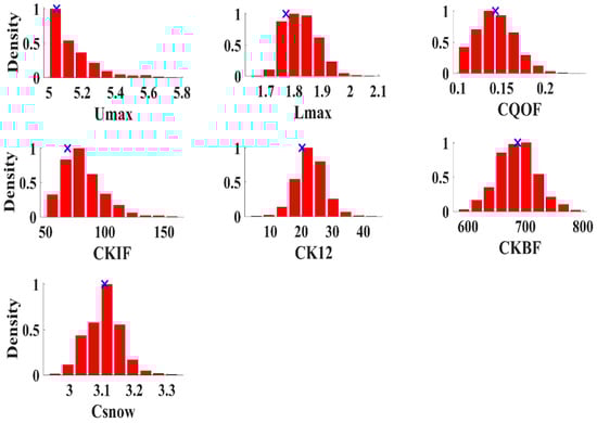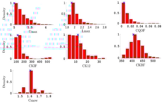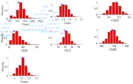 Histograms of posterior probability distribution of NAM parameters (modified) from DREAM without explicit treatment of forcing data error. Optimum parameter value is represented by the cross mark.