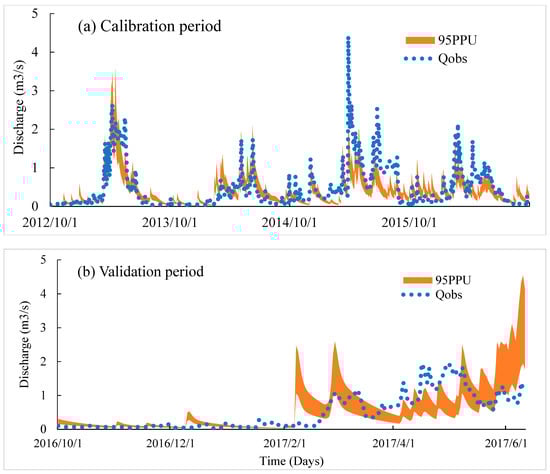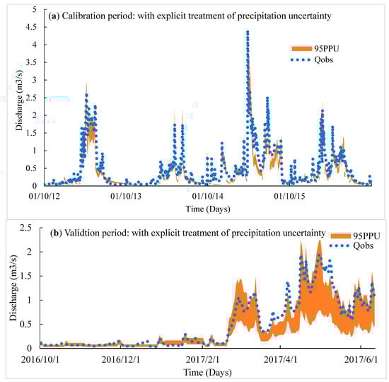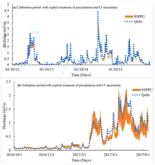 95% prediction uncertainty band are shown in Figure 6 portraying the rendering of model parameter uncertainty into prediction uncertainty. Explicit representation of validation and calibration periods are shown in Figure 6a,b. Even though the simulated uncertainty bands shadowed a matching pattern with the observed stream discharges (calibration period), some large incompatible portions were still present and it looked like the uncertainty bands could not hold maximum observation points. Unexpectedly, the patterns were highly incompatible during the validation period with a broader shaded area, demonstrating the inefficiency of assessed parameters in the validation period. The shaded portion was comparatively thinner during the calibrating stage, but it failed to capture the maximum flows most of the time and the model results were underestimating the observed flow. These results triggered the intuition of having further error causes that could reinforce the surmise of handling the input forcing data errors in an explicit manner.