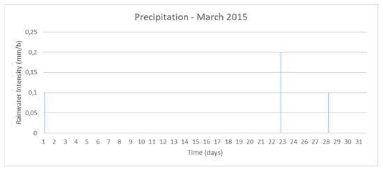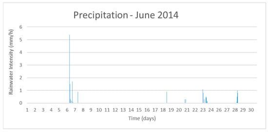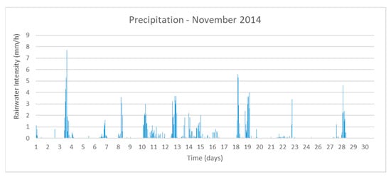 It is possible to observe that in the months of October, November, January, and February, the flow and, consequently, the volume are significantly higher than in the other months due to the fact that these months are the rainiest ones. Figure 3 represents the precipitation records in November 2014, which was the month with the highest rainfall in the period from May 2014 to May 2015 and which corresponds to the highest flow recorded in the network at the entrance to the WWTP, was 18,221, 76 m3.