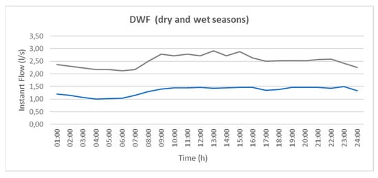 Figure 5 shows the average hourly flows corresponding to the periods without rain, representative of the dry and wet seasons considered.