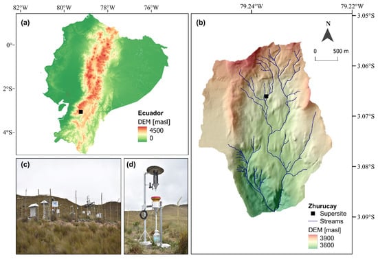 Zhurucay Ecohydrological Observatory: (a) location within Ecuador; (b) location of super-site within Observatory; (c) instrumented super-site hillslope; (d) Juvik fog gauge.