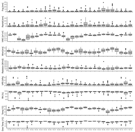In a prior study [], we measured cloud water interception with different passive fog collectors—two cylindrical types (Juvik and Wire Harp) and two flat-screen types—oriented to the two main wind directions. Our results showed that for our study site, cylindrical Juvik type FG performed the best, yielding better fog and cloud water estimations. For this reason, all the analyses for the current study were done with this FG. All of the variables (e.g., fog, rainfall, volumetric water content, meteorological variables) were continuously recorded at 5-min intervals from September 2017 to December 2019. Weather conditions during the study period are shown in Figure 2.