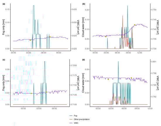 Some examples of the eighty two fog-only and cloud-water events and their corresponding soil volumetric water content (VWC) plotted considering four hours before and after the event. The orange dots represent a reference for the start and the end of the event, to calculate the change in VWC: (a) event 23, Class I event (producing an increase in VWC) (b) event 19, Class I event (producing an increase in VWC); (c) event 59, Class II event (producing no increase in VWC), and (d) event 40, Class II event (producing no increase in VWC).