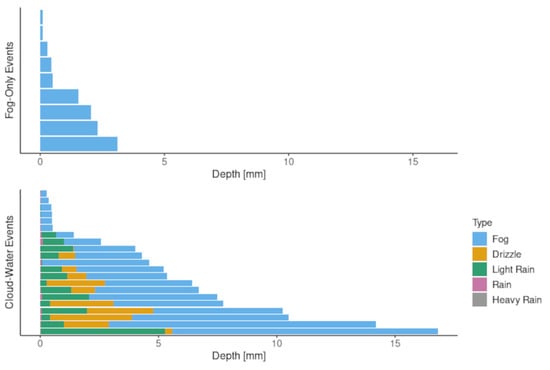 The high-resolution laser disdrometer, with its ability to measure small drops, proved to be an effective instrument for monitoring the other types of precipitation that accompany fog during CW events. We determined that (as shown in Figure 4) the CW events that resulted in EP consisted mainly of fog combined with drizzle and/or light rain and had a total amount per event ranging from 0.3 to 11.3 mm. In addition, all the events occurred in the early morning; and wind speeds during the events varied between 1.5 and 3.4 m s−1. Since fog water contribution is also influenced by fog density and frequency as well as wind speed [], it is plausible that the CW events with low total depth had high fog density and occurred at lower wind speeds.