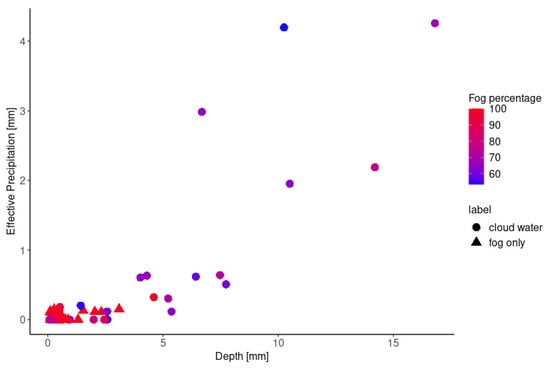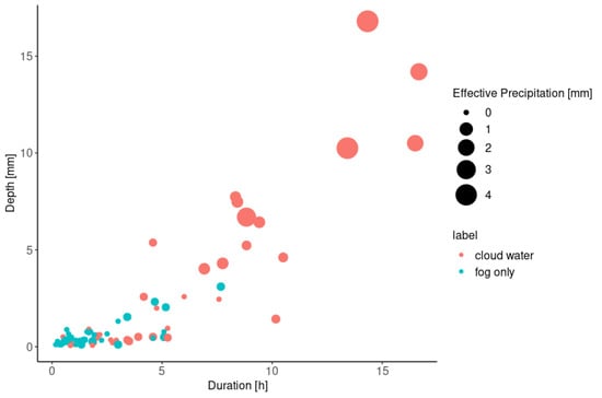 For both FO and CW events, three characteristics did show a direct relationship with EP: duration, total amount per event and intensity (see Appendix A). The duration of FO events varied between 1 h and 8 h (Figure 8), whereas CW events were longer and with intensities > 0.5 mm h−1, which produced higher amounts of EP. Fog density information was beyond the scope and possibilities of this current study, then we assume that FO events were dense enough to cause fog drip to the ground and resulted in EP despite small total depth.