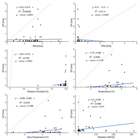 The FO and CW events were plotted on heat-maps in ascending order of their EP amounts, together with the mean values of total depth, duration, and intensity of the events, as well as the available meteorological variables (wind speed, air temperature, dew temperature, relative humidity, radiation, and vapor pressure deficit, see Appendix A). For both FO and CW events, duration, intensity, and total event depth were directly related with increasing EP. Figure 6 shows the linear regression for EP and meteorological variables, the coefficient of determination and p-value from the regression indicate a poor fit of the model; values of R2 < 0.1 were obtained for all the meteorological variables assessed. In addition, Pearson correlation for the same variables showed low coefficients < 0.2 (Figure 7); which demonstrates that EP and the considered meteorological variables are not linearly related.