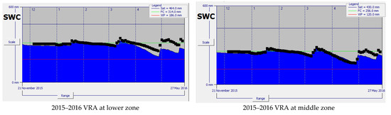AquaCrop allows the impact of climatic conditions to be dissociated from soil fertility. It is evident that the VRA treatment increased soil fertility with a reduced nitrogen rate (81 kg N/ha less than that of the farmer in 2015–2016) and was more effective in the lower zone.