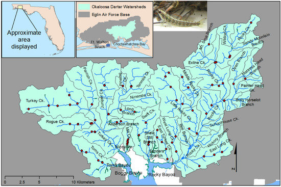 The Okaloosa darter (Etheostoma okaloosae) is a small (<4.9 cm), perch-like, benthic fish (Figure 1, inset) that inhabit only six small (1 to 9 m wide), shallow, clear creek systems that flow almost entirely within Eglin Air Force Base (AFB) and empty into three bayous of Choctawhatchee Bay in Walton and Okaloosa Counties in the panhandle of northwest Florida (Figure 1). In 1973, the species was listed as Endangered by the U.S. Fish and Wildlife Service (USFWS) due to the smothering of the creek habitat by eroded sediments during road and dam construction. Since then, much progress has been made to understand the biology and life history of the Okaloosa darters on Eglin AFB (Figure 1, long-term sampling locations) [1,2]. This information was used successfully to protect existing habitats and to restore imperiled habitats through the correction of erosion, contouring roadways, and planting vegetation in upland areas [3]. Success was facilitated by management by the Jackson Guard Natural Resources Division of Eglin AFB. As a result of these efforts, the Okaloosa darter was downlisted from Endangered to Threatened in 2011 [4].