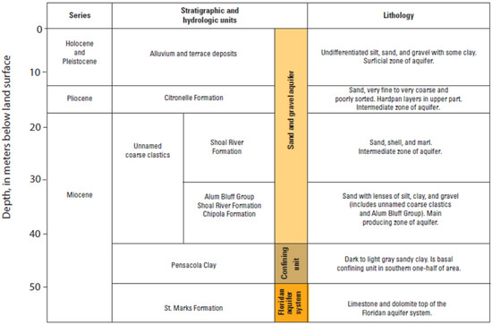 In general, the study area is underlain to depths of 76 m below land surface (bls) by unnamed clastics (sands, silts, clays, and gravels) of Miocene age, the Pliocene Citronelle Formation, and undifferentiated alluvium and terrace deposits of Holocene to Pleistocene age (Figure 2) [9]. These unconsolidated sediments record sedimentation by a prograding bayhead delta facies complex that lies unconformably over the Pensacola Clay of Miocene age. The Pensacola Clay was described by Hayes and Barr [10] as a regional confining unit with low permeability. The Pensacola clay overlies differentiated and undifferentiated limestones of early- to middle-Miocene age that compose the deeper Floridan aquifer system. Most wells that pump groundwater for human consumption tap the Upper Floridan.