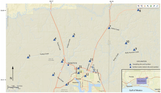 - Trapp, H., Jr.; Pascale, C.A.; Foster, J.B. Water resources of Okaloosa County and Adjacent Areas, Florida. In U.S. Geological Survey Water Resources Investigations 77-9; U.S. Geological Survey: Reston, VA, USA, 1977; p. 86. Available online: https://pubs.er.usgs.gov/publication/wri779 (accessed on 2 January 2021).
