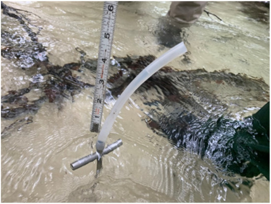 The altitude that groundwater rose above the altitude of a particular creek sampling site was measured using a ‘temporary well’ and tape measure. The temporary well comprised a 6.35 mm bore, stainless steel pipe that had mill-slot screens, and a point on the bottom end, also known as a ‘drivepoint’ or ‘push-point sampler” (DeepWater2 PushPoint Sampler, MHE Products). At each sampling site in the creek, a solid rod was first inserted down the stainless steel pipe before deployment, and this temporary well was manually advanced such that the screen was approximately 1 to 1.2 m below the creek bottom; this depth interval was selected to ensure that the samples were reflective of upwelling groundwater from the upper part of the sand and gravel aquifer, rather than a mixture of groundwater and surface water in the hyporheic zone directly beneath the creek [11,14]. The solid rod was removed, and groundwater entered the now hollow rod though the screen. A short piece of clear tubing was attached to the top of the open rod above the creek water level, and the altitude to which the groundwater rose above the surface-water level, or head, was recorded (Figure 4). To ensure that the head measurements would be comparable across all sites, the temporary well was inserted through the same depth of surface water, which was about 15 cm.