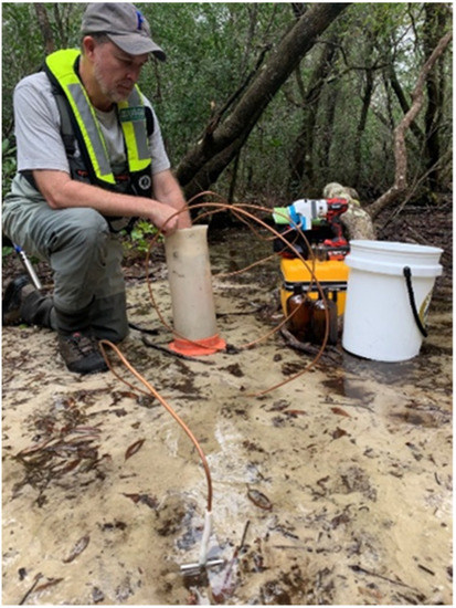 Measurements of the physical properties and chemical constituents of groundwater and surface water, such as dissolved oxygen, pH, specific conductance, and temperature, were measured using two Aqua TROLL 600 Multiparameter Sondes (In-Situ, Inc., Fort Collins, CO, USA). Each sonde was calibrated before each sampling day using appropriate standard methods for dissolved oxygen, pH, and specific conductance, as reported in the USGS National Field Manual [15]. The parameters were measured in groundwater pumped from the temporary well using a peristaltic pump at low-flow rates and into a nylon graduated cylinder where the sonde was placed (the natural flow rate from the temporary well precluded sample collection in a timely manner). Groundwater samples were collected after the measurements of dissolved oxygen, pH, specific conductance, and temperature, as shown by the sonde, had stabilized (Figure 5). The groundwater did not require filtration because of low to zero sample turbidity. Samples of surface water were collected using the same method. Measurements of the physical properties and chemical constituents of the surface water were made using the same method, but by placing the second sonde in the creek water column near the bottom; in all sampling sites, the depth of the surface-water column was about 15 cm.