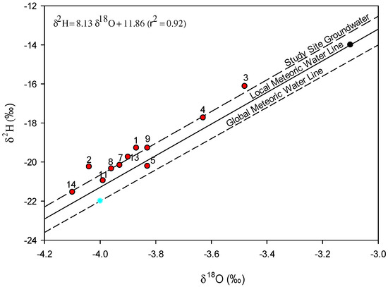 Stable δ2H and δ18O values, in per mil (‰), in groundwater collected 4–6 February 2020, beneath darter creeks, Eglin Air Force Base, near Niceville, Florida. The values for the study sites (numbered; Table 6) are plotted in relation to the global meteoric water line (Adapted from, [21]) and local meteoric water line (Adapted from, [20]). The equation for the line of the study site values is shown in the upper left-hand corner, with r2 indicating the coefficient of determination.