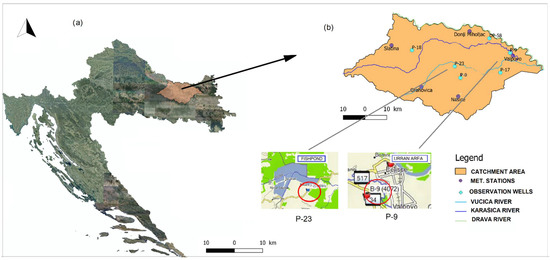 (a) Remote sensing map of study area, https://geoportal.dgu.hr (accessed on 20 March 2022), (b) catchment area with designated main watercourses and observation wells particularly P-29 and P-9.