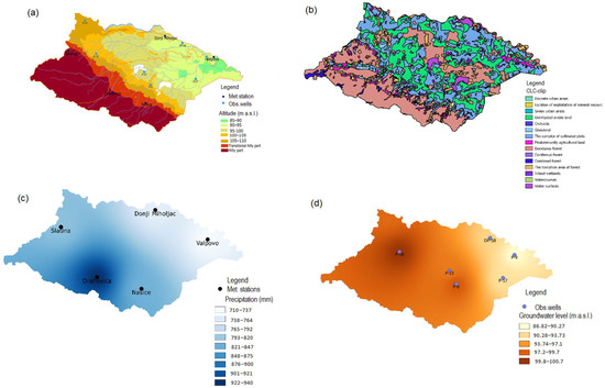 (a) Altitude map of the catchment area, (b) vegetation cover, (c) annual precipitation distribution, (d) mean groundwater level.