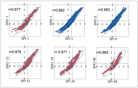 Meteorological drought indices, standardized precipitation index and standardized precipitation evapotranspiration index were compared, in order to define their reliability for further analysis. We calculated their correlations over different time scales (1 to 48 months). The results are presented in Figure 4, showing a very high level of correlation.