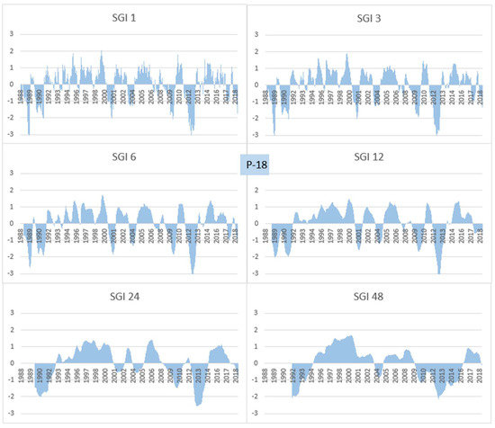 SGI values for 1, 3, 6, 12, 24, and 48 months (observation well P-18).