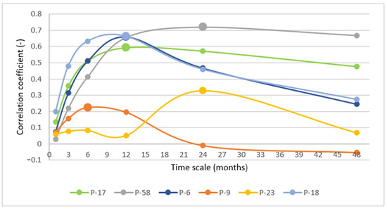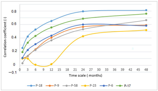 Observed results showed lower and more variable correlation values. The correlation between the SPI and groundwater level (GW) was the highest at different time scales (6 to 24 months) for all observation wells. Maximum correlations between SPI and GW ranged between 0.22 and 0.72, as shown in Figure 8. The correlation coefficients showed much higher variability related to the position and depth of observation wells. Again, only shallow observation well P-23 had specific behavior because of its dependence on surface water (fishpond). Its SPI/GW correlation coefficients were, compared with others, very low. Additionally, P-9 had a relatively low correlation (even negative) with meteorological drought, due to its position in the urban area, very close to the Karašica River. It is a deep observation well and it was probably strongly impacted by deeper aquifers (Figure 1).