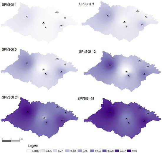 Calculated SGI was correlated to the SPI of the nearest meteorological station. The SPI/SGI correlation coefficients for most observation wells were continuously increasing over different time scales. Only P-23 exhibited a typical behavior. According to Table 2, it is a shallow piezometer located close to the fishpond (Figure 1), and its groundwater table was strongly impacted by surface water. It exceeded the maximum SPI/SGI correlation at the 48 month time scale, similar to the others, but the correlation coefficient at the 1 month scale was higher than on the 6 and 12 month scales. Very high correlation coefficients for P-18 were only at the 24 and 48 month scales, and for P-17 at the 48 month scale. For the other wells, except for P-23, the correlations were moderate at 24 and 48 months. The spatial distributions of the calculated SPI/SGI correlations over different time scales are presented in Figure 7. The highest values of the correlation function for all observation wells were at the longest time scale (48 months), with very high correlation coefficients.
